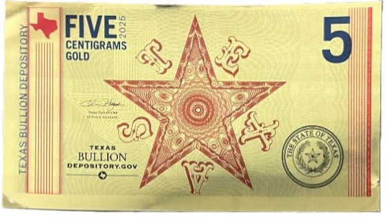 The original Texas “redbacks” were promissory notes issued by the Republic of Texas between 1839 and 1840. The notes earned their nickname from the iconic red lone star surrounded by T-E-X-A-S that appeared on the reverse of each note.History tells us the original redback became “worth less than the paper it was printed on.” The Modern Redback avoids that problem by introducing a series of 24K commemorative gold notes inspired by the original design, each of which contains a precise and verifiable layer pure gold deposited onto a durable polymer substrate.